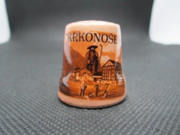 Sběratelský porcelánový náprstek - Krkonoše - zajímavosti, hnědý. Náprstek je bez otluků a prasklin.