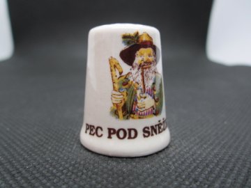 Sběratelský náprstek - Pec pod Sněžkou - s Krakonošem, glazovaná keramika, bílý. Náprstek je bez otluků a prasklin.