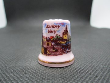 Sběratelský porcelánový náprstek - Karlovy Vary, zn. Porceleine Fine Chodov, na růžovém porcelánu. Náprstek je značený, bez otluků a prasklin.