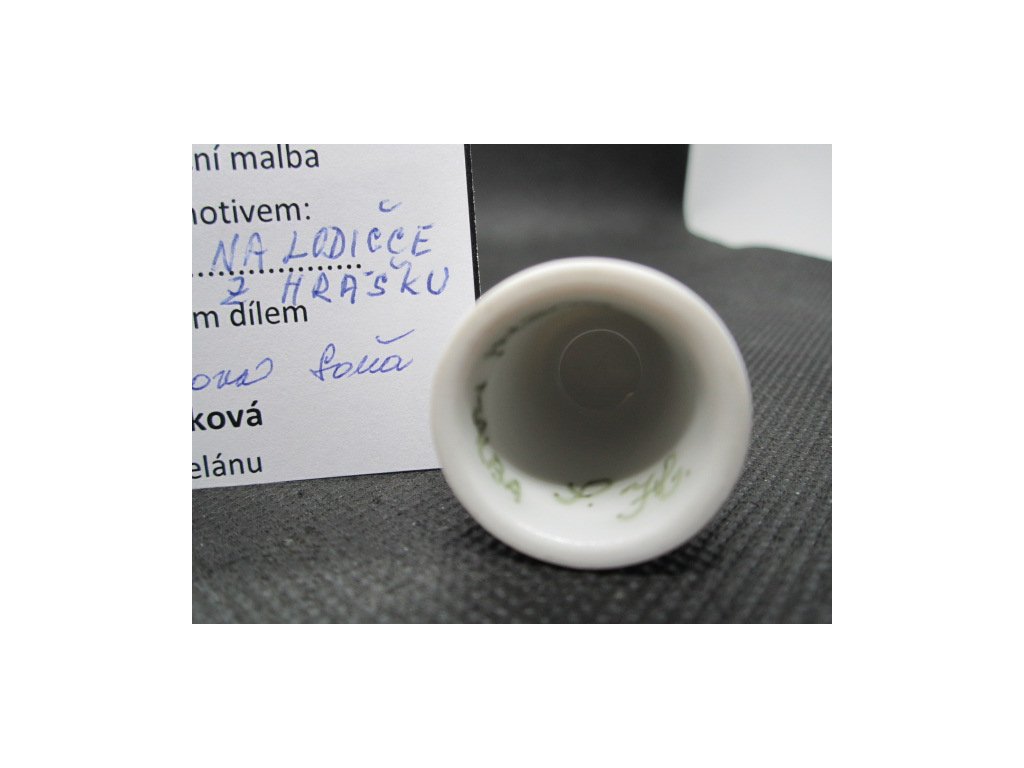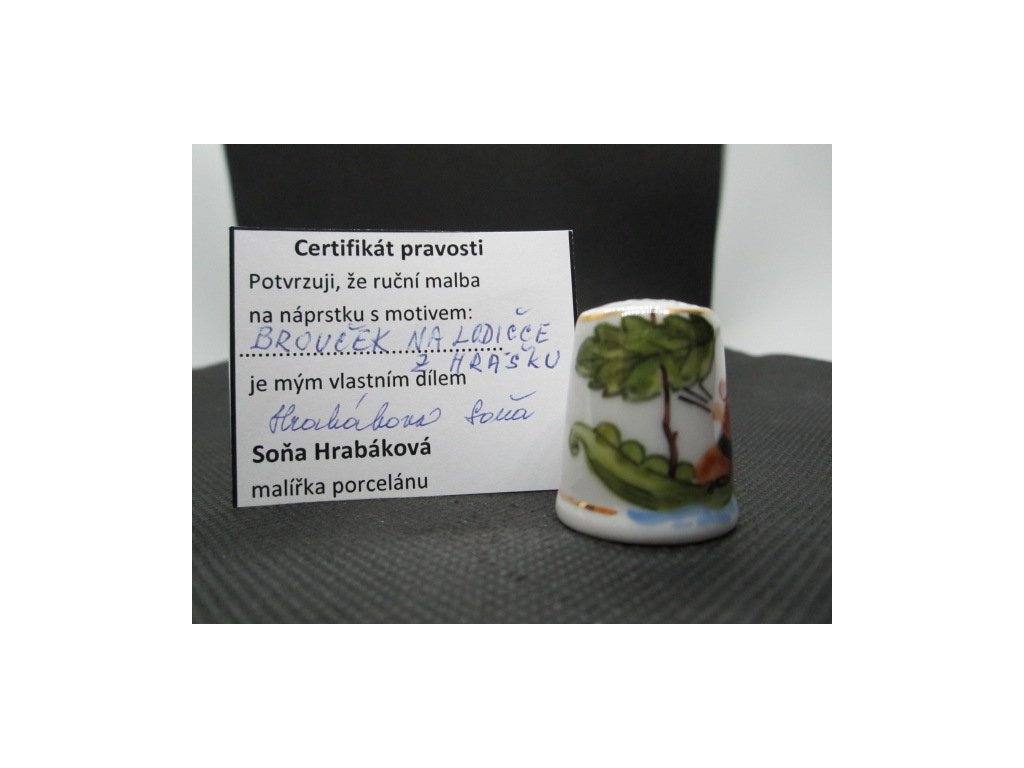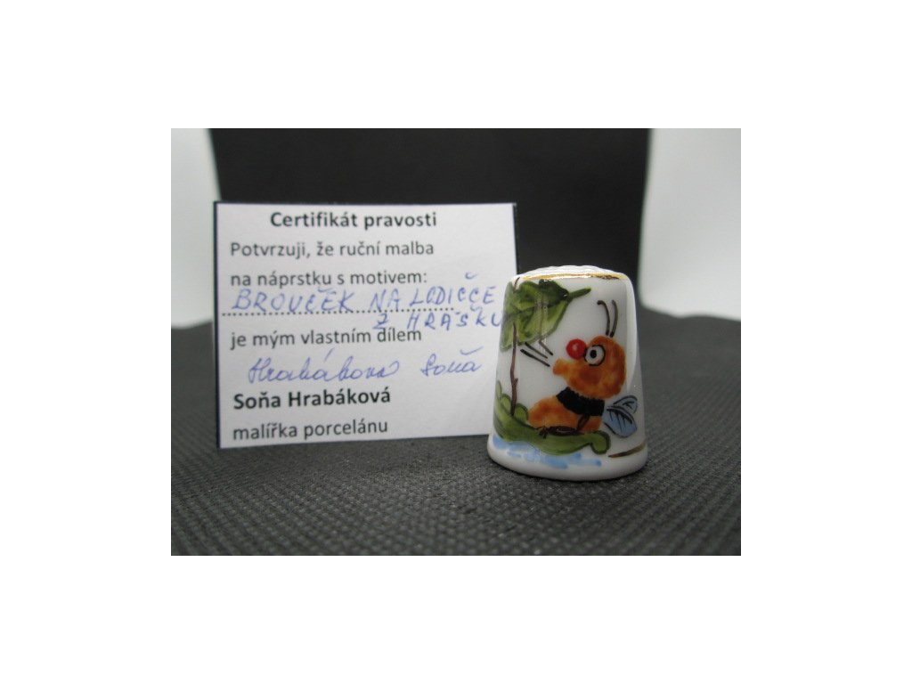 Sběratelský náprstek - Brouček na lodičce z hrášku - Hrabáková Soňa, s certifikátem, ruční malba