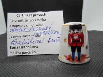 Sběratelský porcelánový náprstek - Vánoční - červený Louskáček - Hrabáková Soňa, s certifikátem, ruční malba. Náprstek je bez otluků a prasklin.