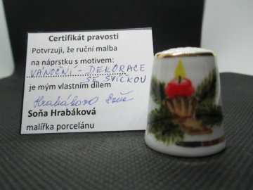 Sběratelský porcelánový náprstek - Vánoční - dekorace se svíčkou - Hrabáková Soňa, s certifikátem, ruční malba. Náprstek je bez otluků a prasklin.