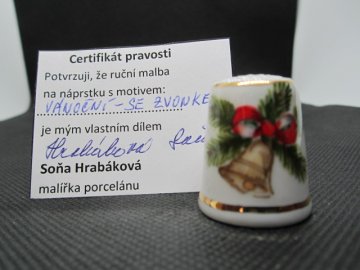 Sběratelský porcelánový náprstek - Vánoční - se zvonkem - Hrabáková Soňa, s certifikátem, ruční malba. Náprstek je bez otluků a prasklin.