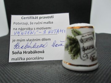 Sběratelský porcelánový náprstek - Vánoční - s notami - Hrabáková Soňa, s certifikátem, ruční malba. Náprstek je bez otluků a prasklin.