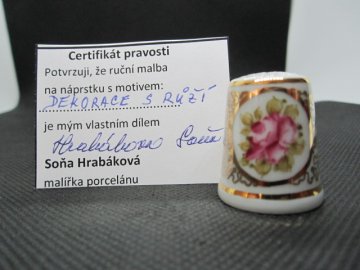 Sběratelský porcelánový náprstek - Dekorace s růží - Hrabáková Soňa, s certifikátem, ruční malba. Náprstek je bez otluků a prasklin.