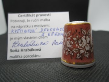 Sběratelský porcelánový náprstek - Květinová dekorace s růžemi - Hrabáková Soňa, s certifikátem, ruční malba. Náprstek je bez otluků a prasklin.
