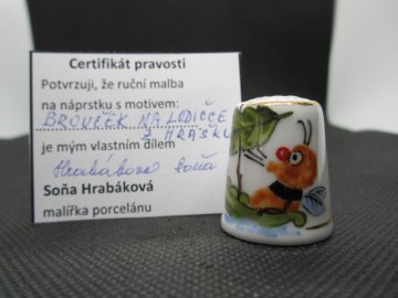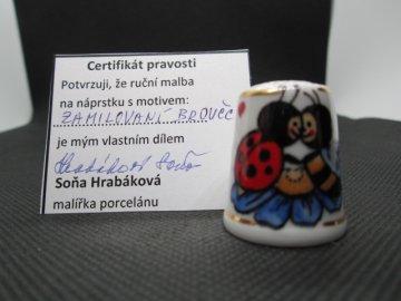 Sběratelský porcelánový náprstek - Zamilovaní broučci - Hrabáková Soňa, s certifikátem, ruční malba. Náprstek je bez otluků a prasklin.
