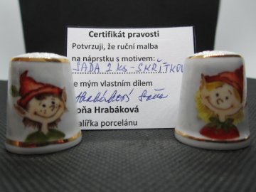 Sběratelský porcelánový náprstek - Sada 2 ks - Skřítkové - Hrabáková Soňa, s certifikátem, ruční malba. Náprstky jsou bez otluků a prasklin.