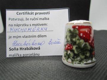 Sběratelský porcelánový náprstek - Muchomůrky - Hrabáková Soňa, s certifikátem, ruční malba. Náprstek je bez otluků a prasklin.