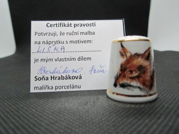Sběratelský porcelánový náprstek - Liška - Hrabáková Soňa, s certifikátem, ruční malba. Náprstek je bez otluků a prasklin.