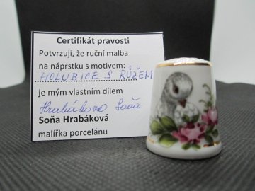 Sběratelský porcelánový náprstek - Holubice s růžemi - Hrabáková Soňa, s certifikátem, ruční malba. Náprstek je bez otluků a prasklin.