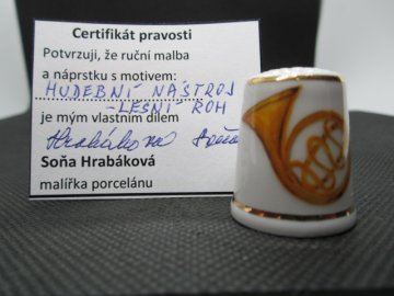 Sběratelský porcelánový náprstek - Hudební nástroj - Lesní roh - Hrabáková Soňa, s certifikátem, ruční malba. Náprstek je bez otluků a prasklin.