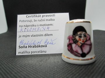 Sběratelský porcelánový náprstek - Kolombína - Hrabáková Soňa, s certifikátem, ruční malba. Náprstek je bez otluků a prasklin.